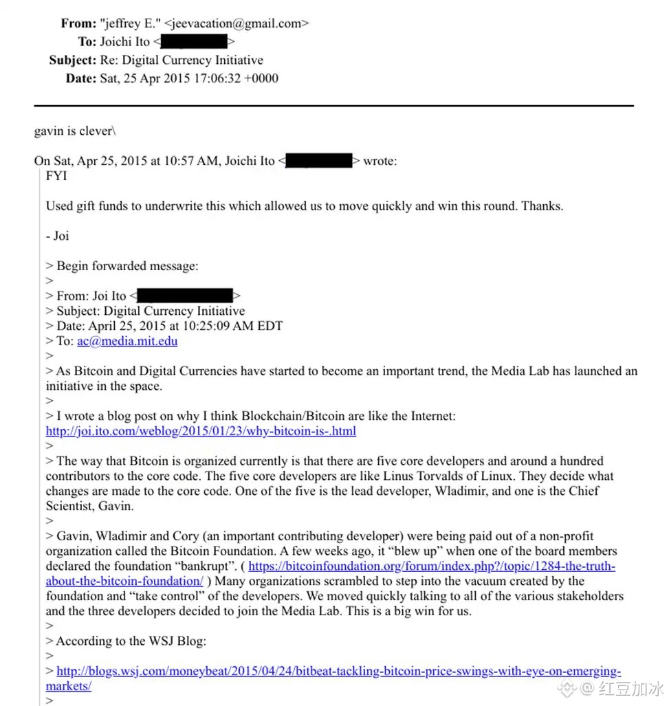 2015年,时任MIT媒体实验室主任的伊藤穰一在给爱泼斯坦的邮件中写道:“多亏了这笔礼物资金,让我们能够快速行动并赢得这一轮。”他补充解释,因为“许多组织都想趁虚而入控制比特币的开发者”。