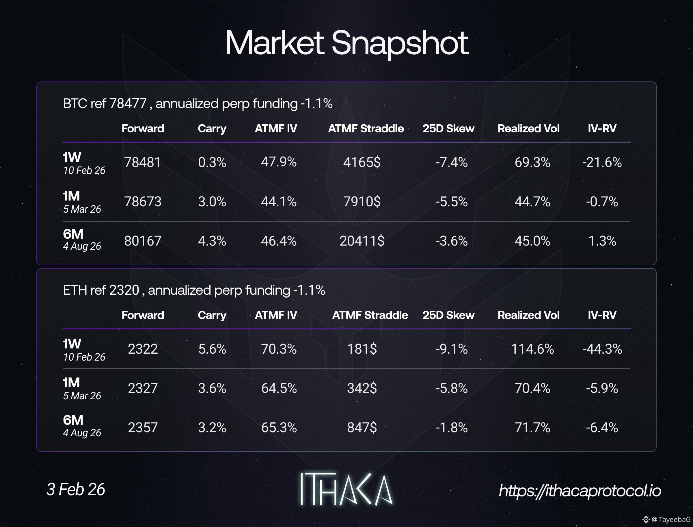 $ETH shows deeper stress. Negative funding, extreme short-term realized vol, and very heavy downside skew point to forced hedging and capitulation flows still playing out.