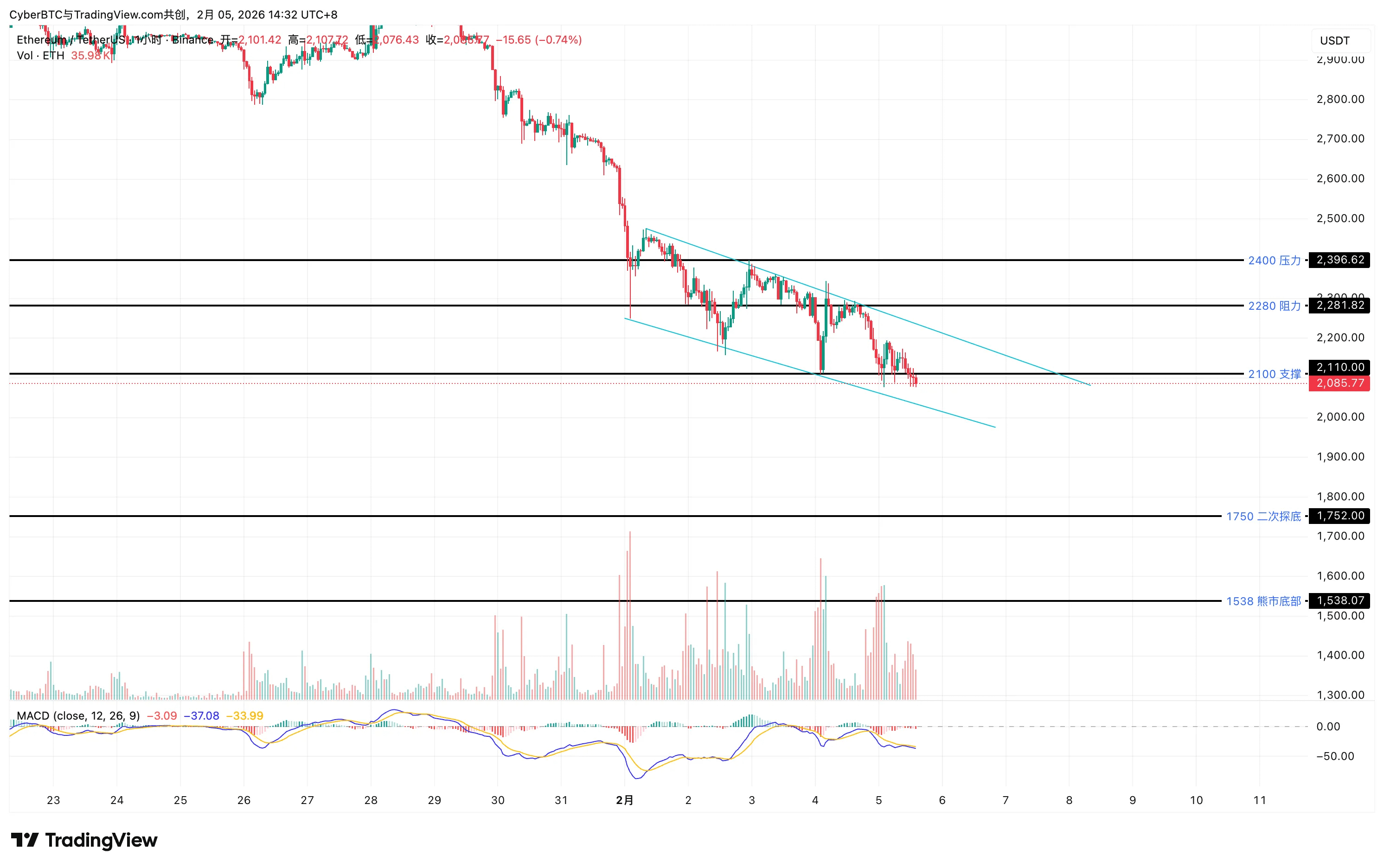 • 关键测试位:2,100美元(由前支撑转化为阻力)