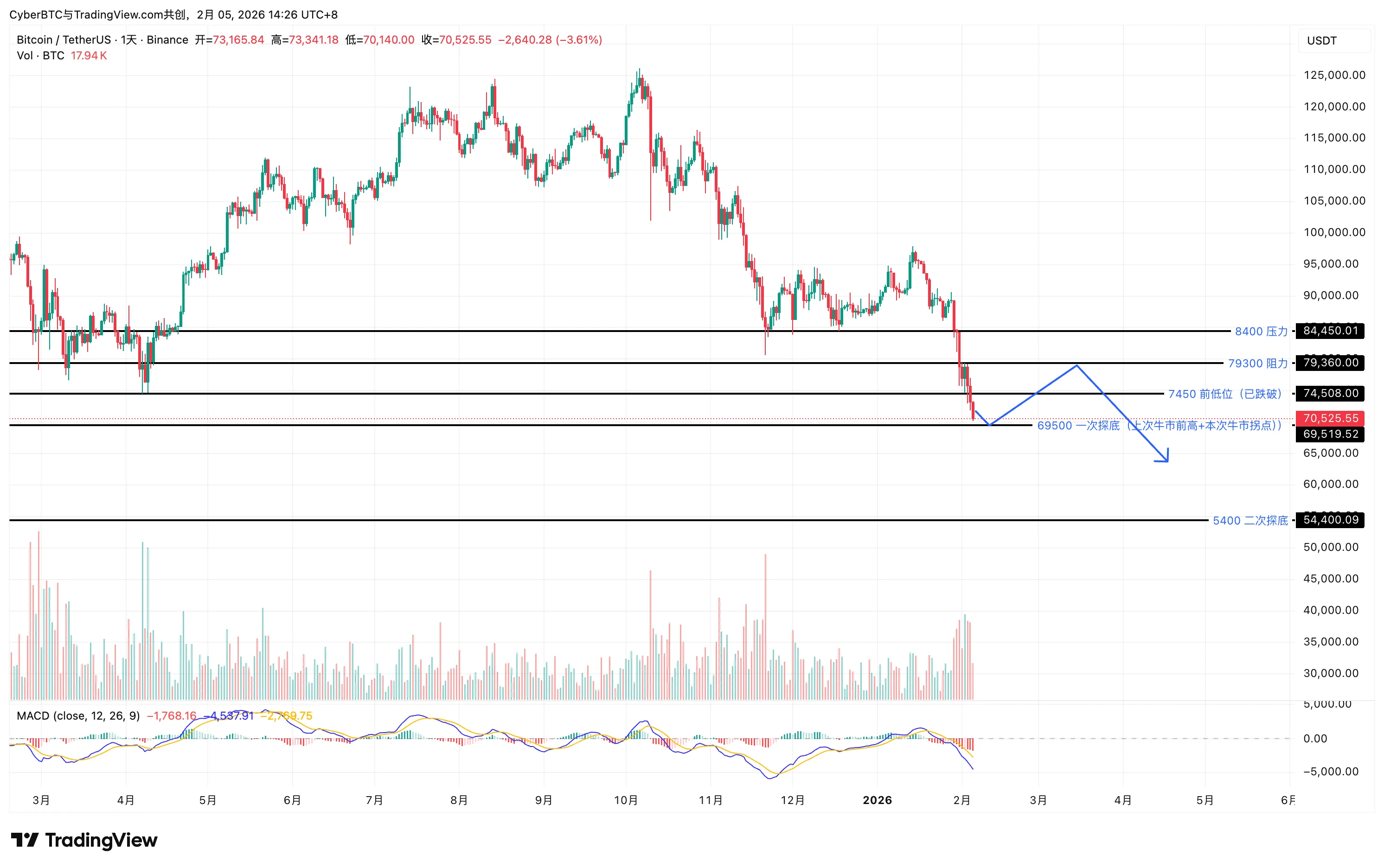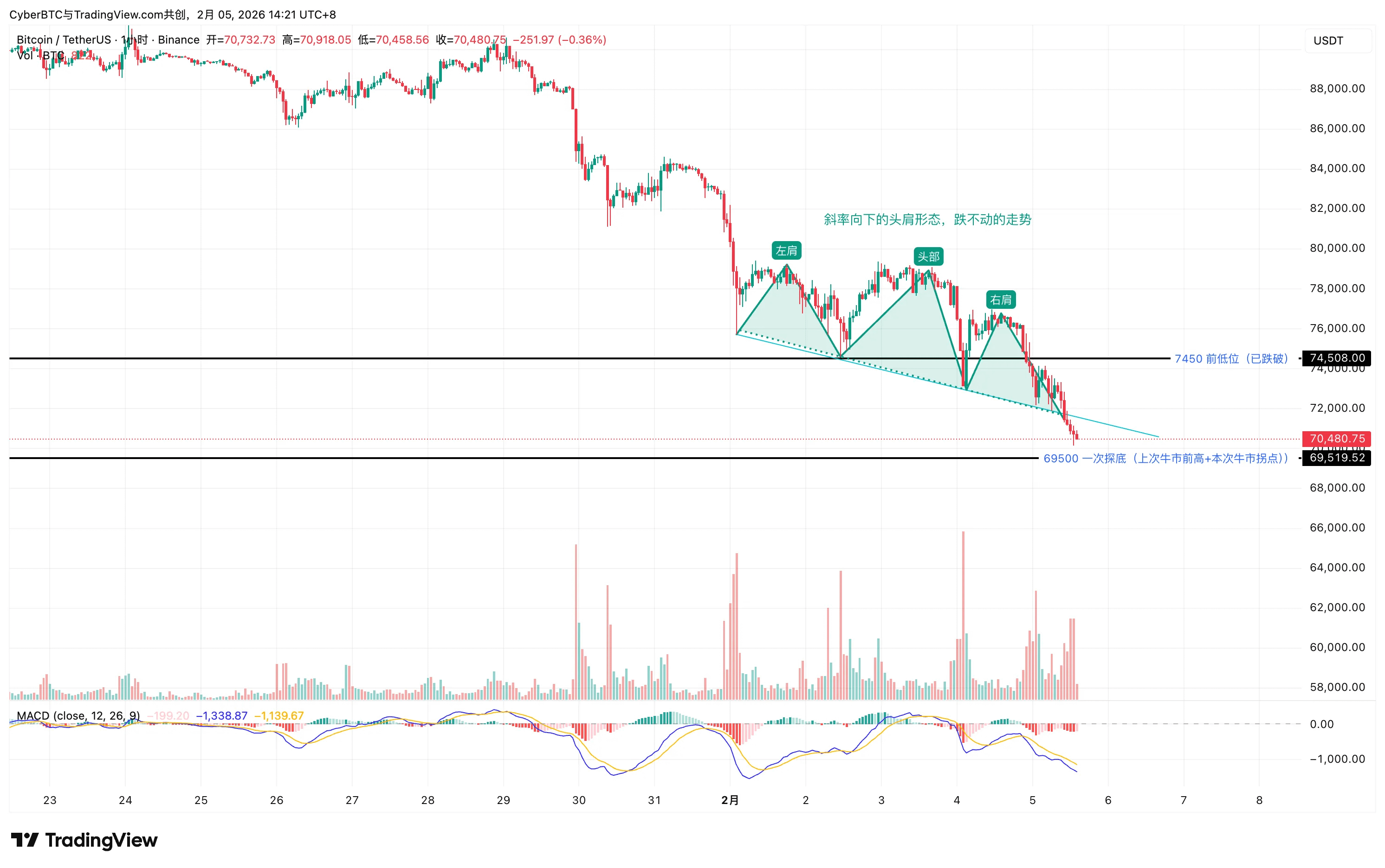• 69,500美元(核心关键位):此位置若被放量跌破且未能快速收复,将打开更大的下行空间,后市难以预测。