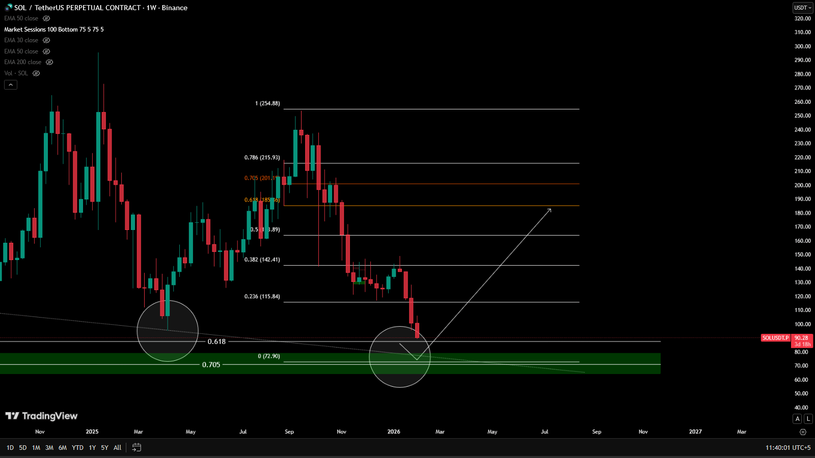 A final dip into the $70–$75 region, followed by a full bullish reversal