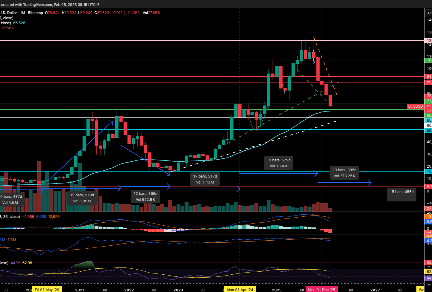 In this cycle, that puts my primary bottom target in the low-to-mid $60Ks, roughly $60K–$65K, where you’ve got confluence from prior consolidation, high open interest resets, and long-term moving average support. If panic accelerates and macro liquidity tightens, a deeper wick toward the high $50Ks wouldn’t shock me, but that starts to look more like a liquidation event than a sustained value zone.