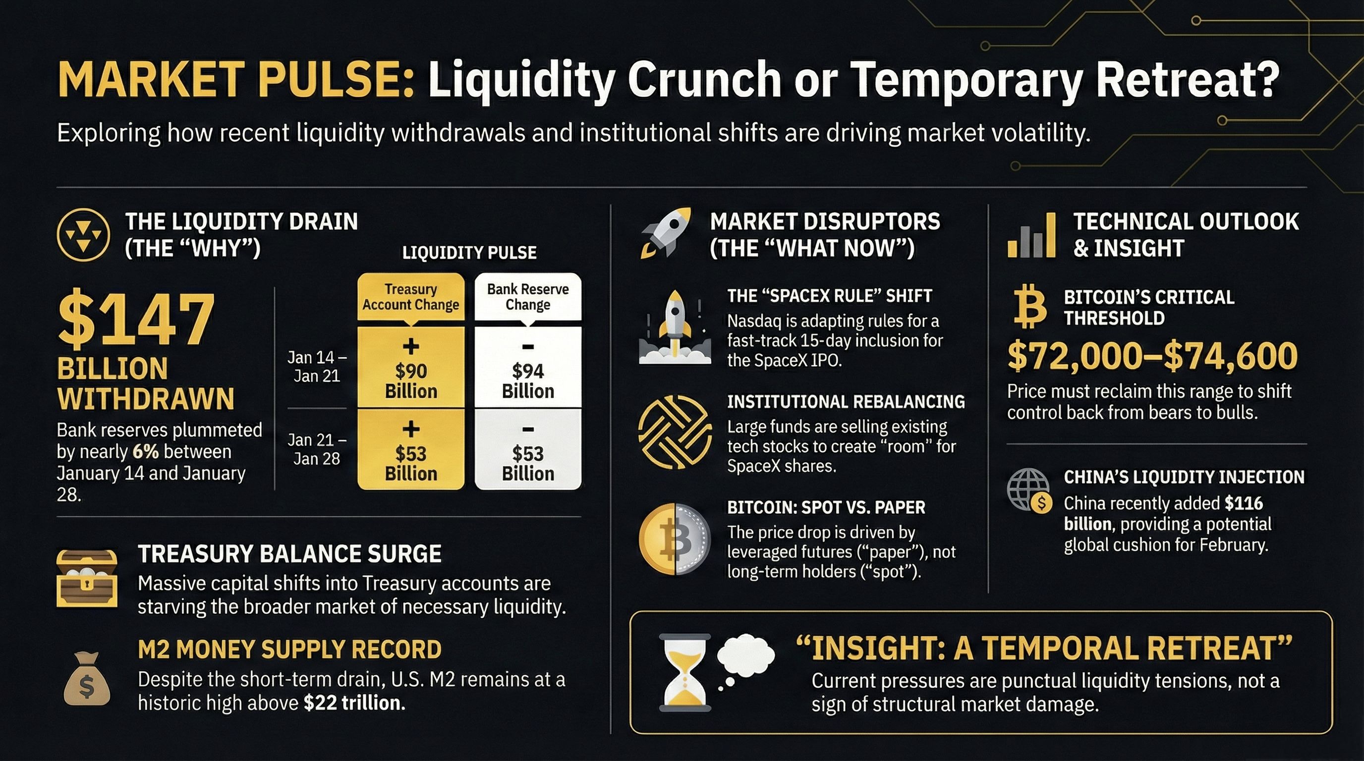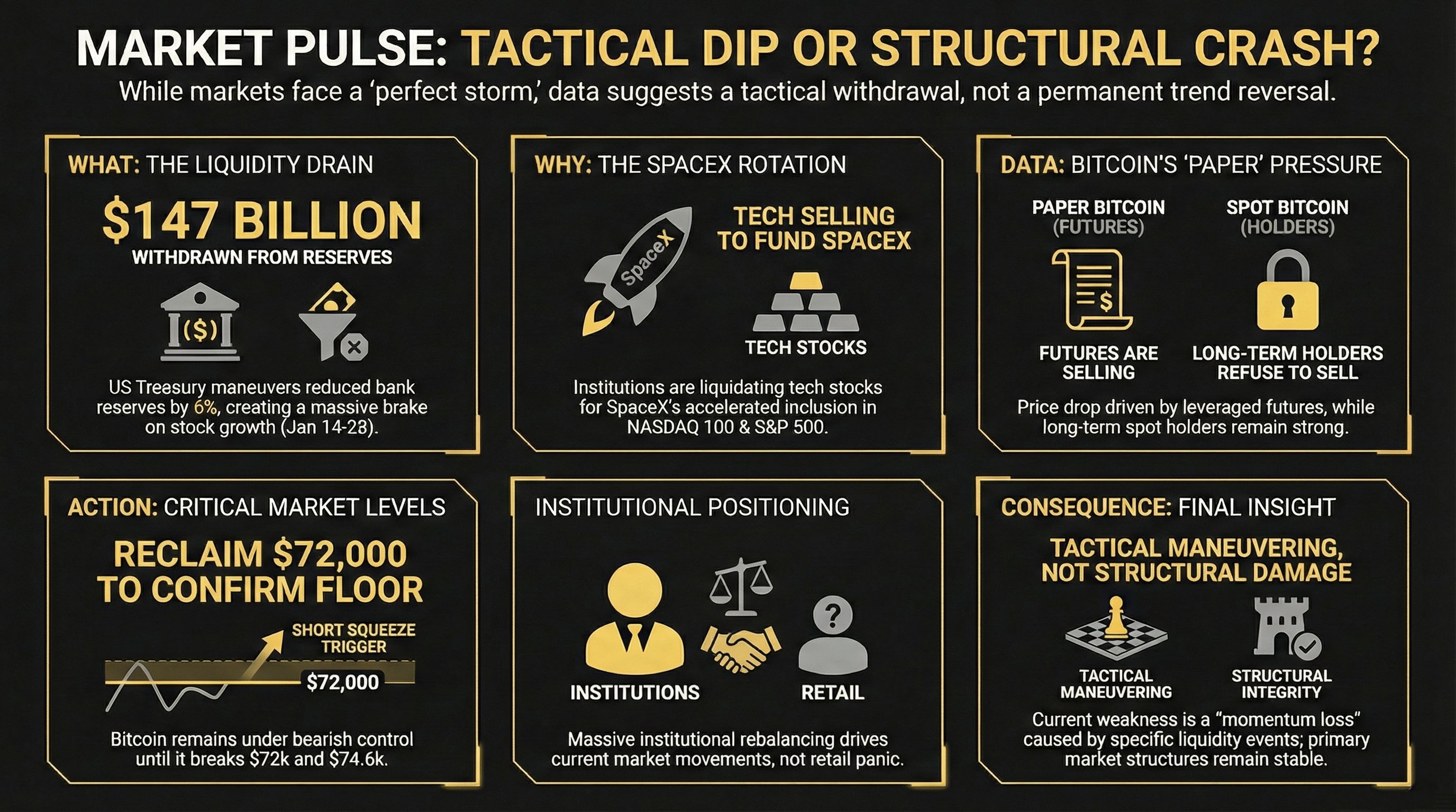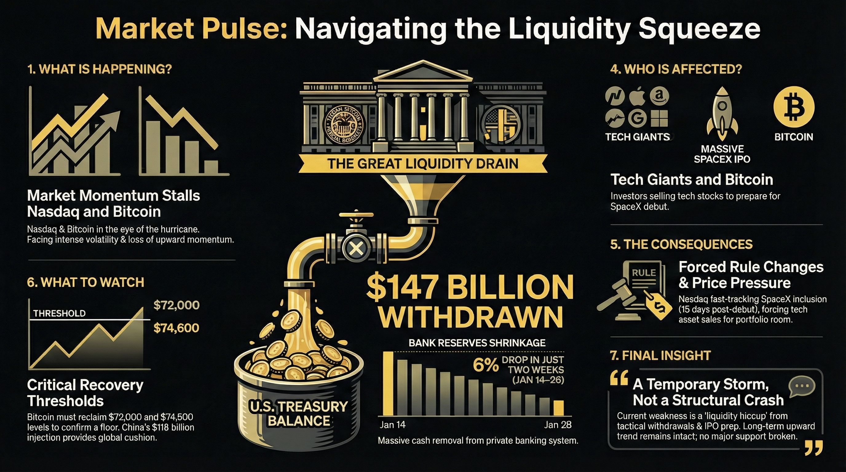 The current market environment is a masterclass in "forced digestion." The combination of a $147 billion liquidity drain, the mechanical rebalancing for SpaceX, and the derivative-led volatility in Bitcoin has created a temporary vacuum in momentum.