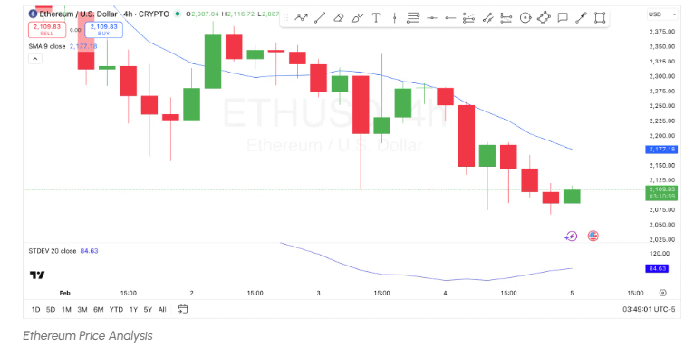 On the resistance front, Ethereum faces immediate barriers at the $2,170–$2,180 zone, aligning with the 9-period simple moving average. A breakout above this level would likely target higher resistance near $2,250–$2,300, where bears have recently sold.