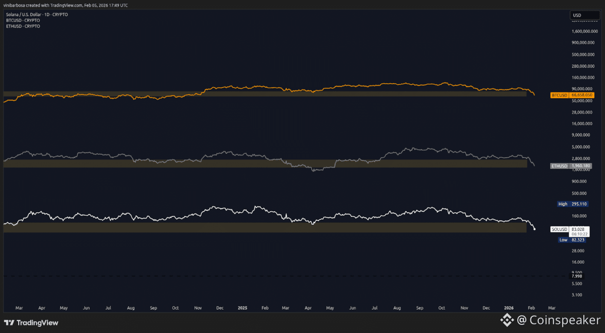 Bitcoin, Ethereum, and Solana 1D price charts, as of February 5, 2026 | Source: TradingView