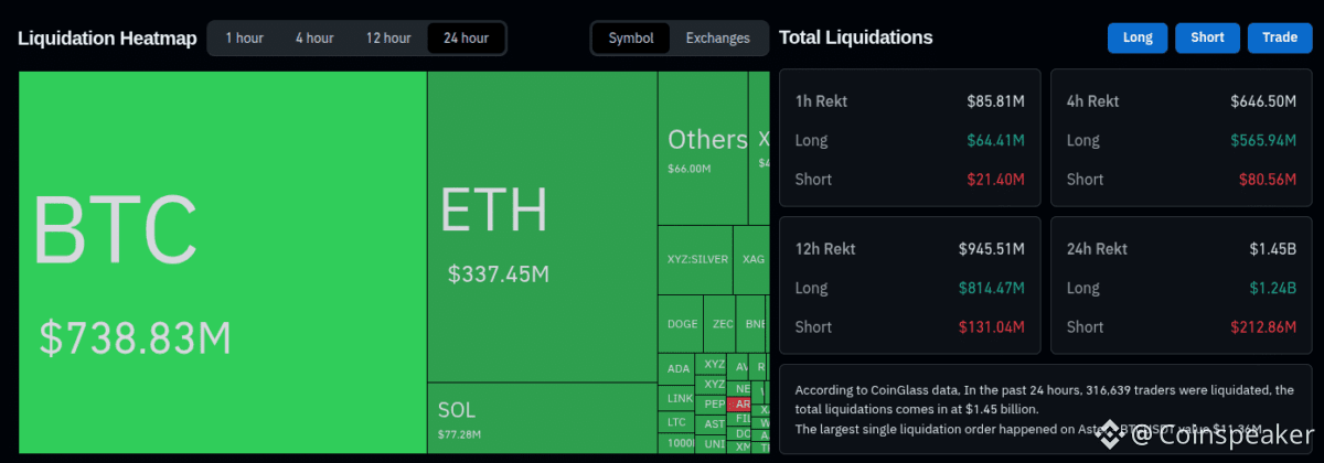 Long positions were the most affected ones, accounting for $1.24 billion out of the $1.45 billion recorded so far. Bitcoin BTC $65 340 24h volatility: 11.5% Market cap: $1.31 T Vol. 24h: $116.64 B leads the liquidations by a large margin, totaling $738.83 million—two times more than Ethereum ETH $1 918 24h volatility: 11.3% Market cap: $232.00 B Vol. 24h: $55.40 B at $337.45 million in second place. Solana SOL $81.40 24h volatility: 11.9% Market cap: $46.16 B Vol. 24h: $9.74 B has the third-largest liquidations at $77.28 million.