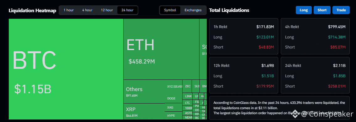 According to CoinGlass data, 433,413 traders got liquidated across all cryptocurrencies over the past 24 hours, wiping out $2.11 billion worth of positions. Bitcoin alone accounted for $1.15 billion in forced liquidations as of this writing,