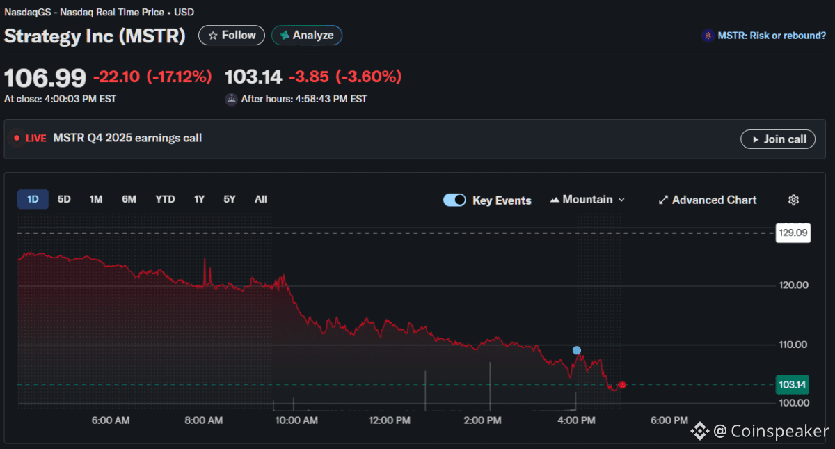 The post MSTR Stock Plunges 17% as Strategy Reports $12.4B Bitcoin Loss in Q4 2025 appeared first on Coinspeaker.