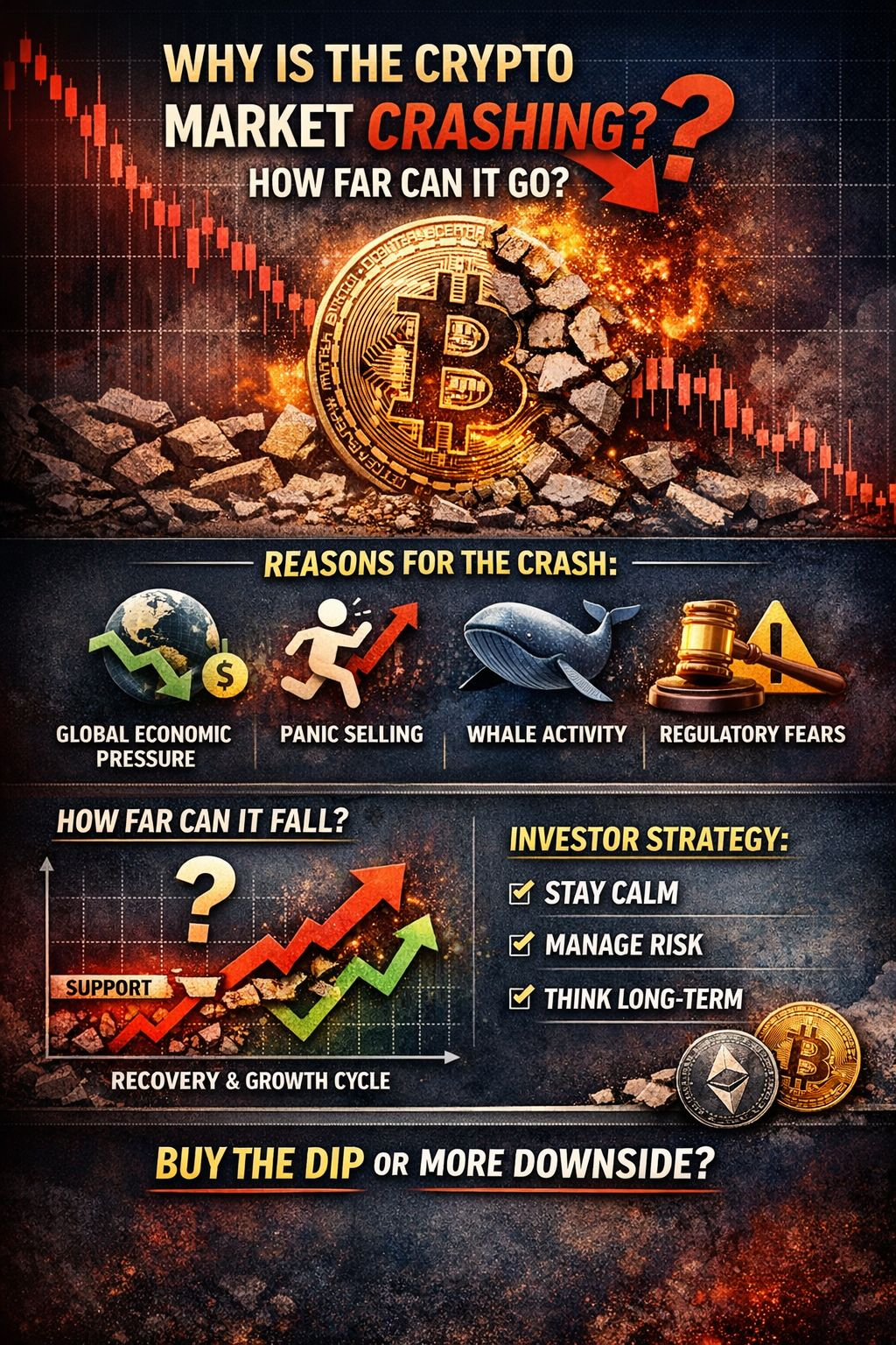 The crypto market is currently experiencing a strong correction, with Bitcoin and major altcoins under heavy pressure. Many investors are asking: Why is the market crashing, and how much further can it fall?