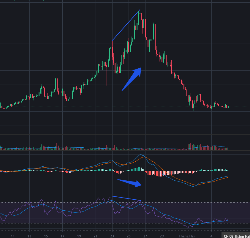 Qua chart trên ta thấy rõ, khi thị trường có xu hướng quá mua cao sẽ tạo ra áp lực mua vào làm giá tăng mạnh nhưng khi đạt được mức trên 70 thì lực mua sẽ dần yếu đi cho thấy sự chốt lời của các nhà đầu tư và trên ảnh RSI đã phân kỳ 2 đỉnh với đường giá, báo hiệu xu hướng đảo chiều