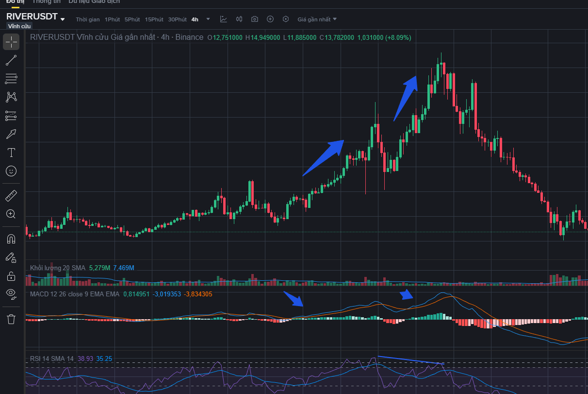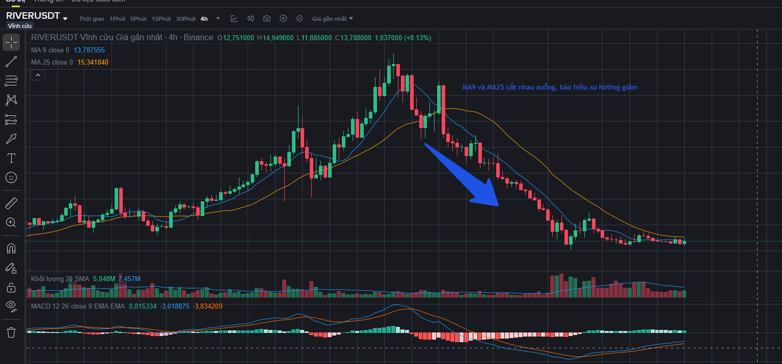 Qua biểu đồ trên, chúng ta có thể thấy rõ ràng MA9 cắt xuống MA25 báo hiệu một xu hướng giảm của RIVER trong khung H4