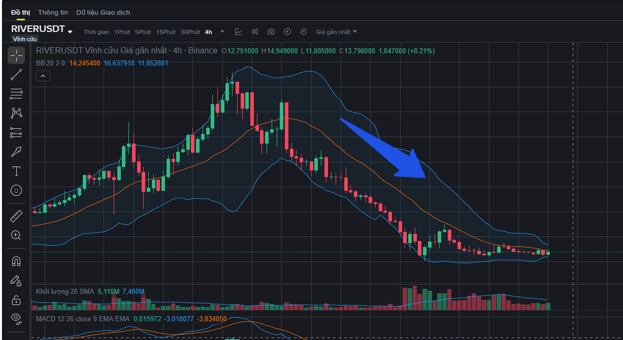 Qua biểu đồ trên, ta có thể thấy giá đang giao dịch dưới Lower Band và giảm liên tục sau đó