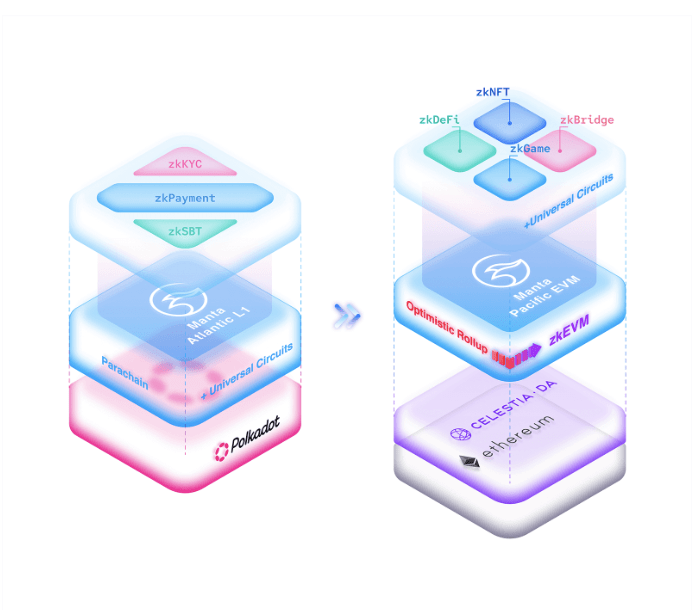发源于对超越当前区块链解决方案限制的远见倡议,Manta Network 引入了一个多模块生态系统,包括两个区块链网络。这些网络提供先进的 ZK 工具,优化了 ZK 应用的部署流程—— Manta Pacific 和 Manta Atlantic。