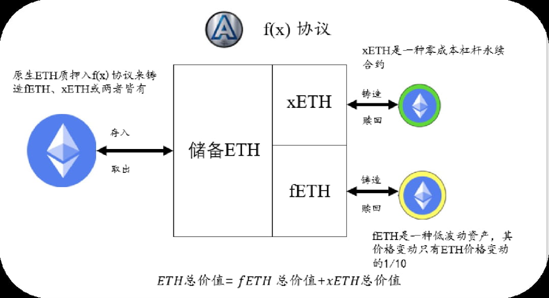 简单地说,f(x)协议就是让用户用ETH来生成fETH和xETH,然后用这两种代币来分别享受不同程度的ETH价格变化。fETH的价格只会跟随ETH价格变化的10%,也就是说它有一个0.1的β系数。xETH的价格则会反映出fETH没有体现的ETH价格变化,也就是说它有一个大于1的β系数。这样一来,fETH就相当于一个浮动的稳定币,而xETH就相当于一个杠杆化的长期投资工具。