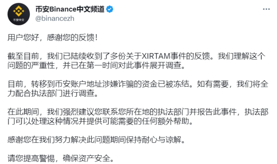 XIRTAM几轮共计募集了大约2000个ETH。有意思的是随后跑路的项目方将募集的ETH转入了Binance,目前Binance已经协助冻结资金,受害者尽快找寻好损失的资金证据去报警,提交给客服,这也说明项目方的跑路经验不足。