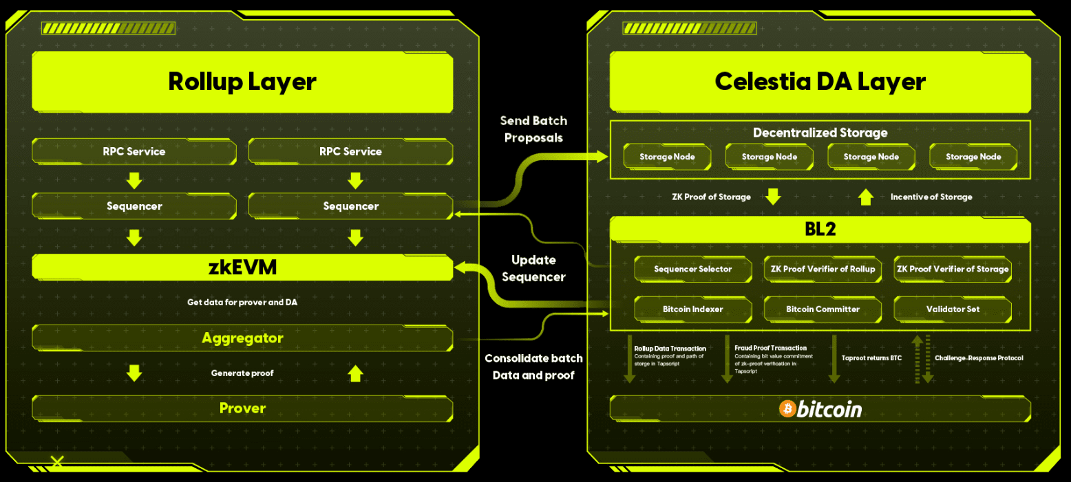 BL2 is a zkRollup Bitcoin Layer2 based on the VM Common Protocol (the official preconfigured VM protocol that is compatible with all major VMs). similar to other zkRollup Layers, its Rollup Layer mainly packs transactions and generates the corresponding zero-knowledge certificates through zkEVM. BL2's DA layer introduces Celestia to store bulk transaction data and only uses the BL2 network to store the zero-knowledge proofs, and finally returns the zero-knowledge proofs validation and a small amount of validation data, including BVC, to the main network for settlement.