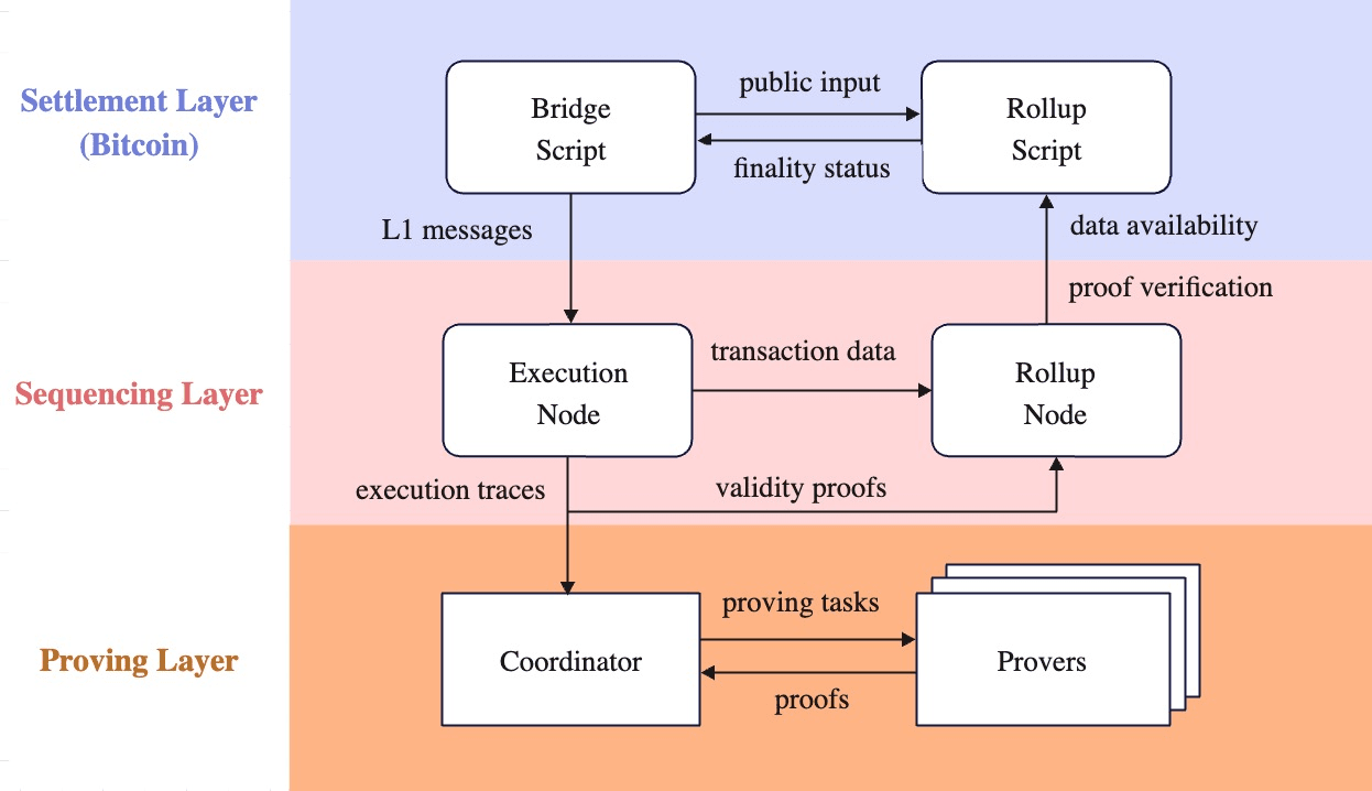 SatoshiVM is an EVM compatible zkRollup Layer2 solution for Bitcoin. The implementation of smart contracts on SatoshiVM is the same as on BitVM, using Taproot circuits to simulate complex functions. SatoshiVM is divided into three layers, the Settlement Layer, the Sequencing Layer and the Proving Layer. The Settlement Layer, also known as the Bitcoin mainnet, is responsible for providing the DA layer, storing the Merkle Roots and Zero Knowledge Proofs of transactions, and settling transactions by verifying the correctness of the Layer2 packaged transactions through the Taproot circuit. The Sequencing Layer is responsible for packaging and processing transactions, and returning the results of the transactions to the mainnet along with the zero-knowledge certificates, and the Proving Layer is responsible for generating zero-knowledge certificates for the tasks received from the Sequencing Layer and passing them back to the Sequencing Layer.