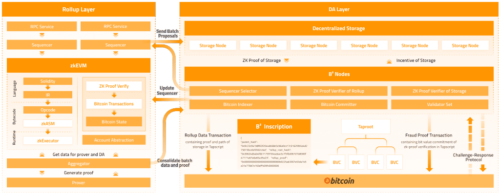 The B2 Network is a zkRollup Layer2 with Bitcoin as the settlement layer and DA layer, which is structured into a Rollup Layer and a DA Layer. User transactions are first submitted and processed in the Rollup Layer, which uses a zkEVM scheme to execute user transactions and output the associated proofs, followed by storage of user state in the zkRollup Layer. The batch transactions and generated zero-knowledge proofs are forwarded to the DA Layer for storage and validation. The DA Layer can be subdivided into three parts: the Decentralised Storage Node, the B2 Node, and Bitcoin mainnet. The decentralised storage node receives the Rollup data and periodically generates temporal and spatial zero-knowledge proofs based on the Rollup data and sends the generated zero-knowledge proofs to the B2 Node, which is responsible for off-chain validation of the data, and then records the transaction data and corresponding zero-knowledge proofs in TapScript on the Bitcoin mainnet after validation is completed. The B2 Node is responsible for confirming the authenticity of the ZKP and finalising the settlement.
