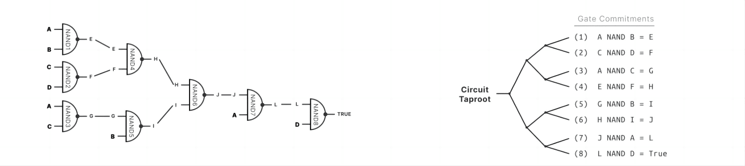 BCC (Binary Circuit Commitment): Based on LGC circuits, we can construct specific gate relationships between inputs and outputs. In BCC gate circuits, this input comes from the corresponding hash-primary image in the TapScript script, and different Taproot addresses correspond to a different gate, which we call a TapLeaf, and the many TapLeafs make up a Taptree, which serves as the input to the BCC circuit.