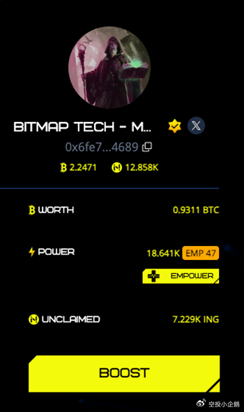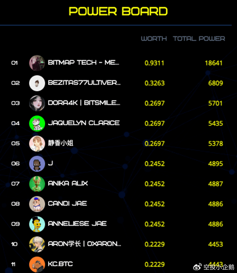 每一个影响者目前共有两个属性,分别为 Worth 和 Power,如下图中Bitmap Tech 的 WORTH 为0.9311 BTC,POWER 为 18.64k 。