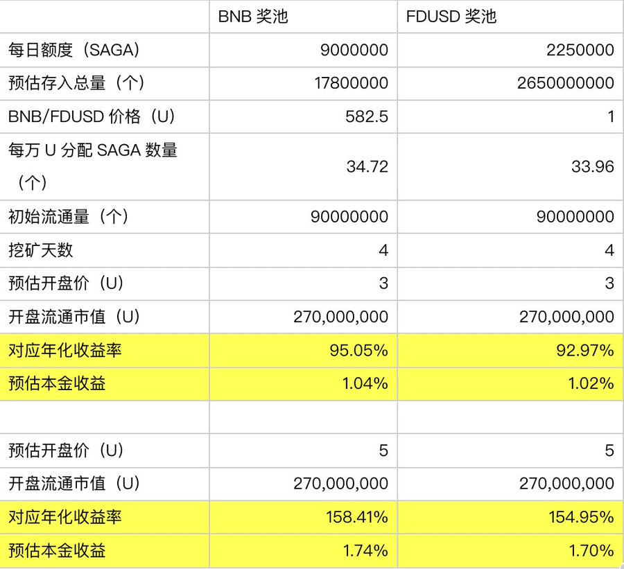 本次假设按照预估SAGA开盘价3u计算,质押bnb收益率约95%,按照开盘价5U计划,收益率约158%。数据仅供参考,DYOR哦~