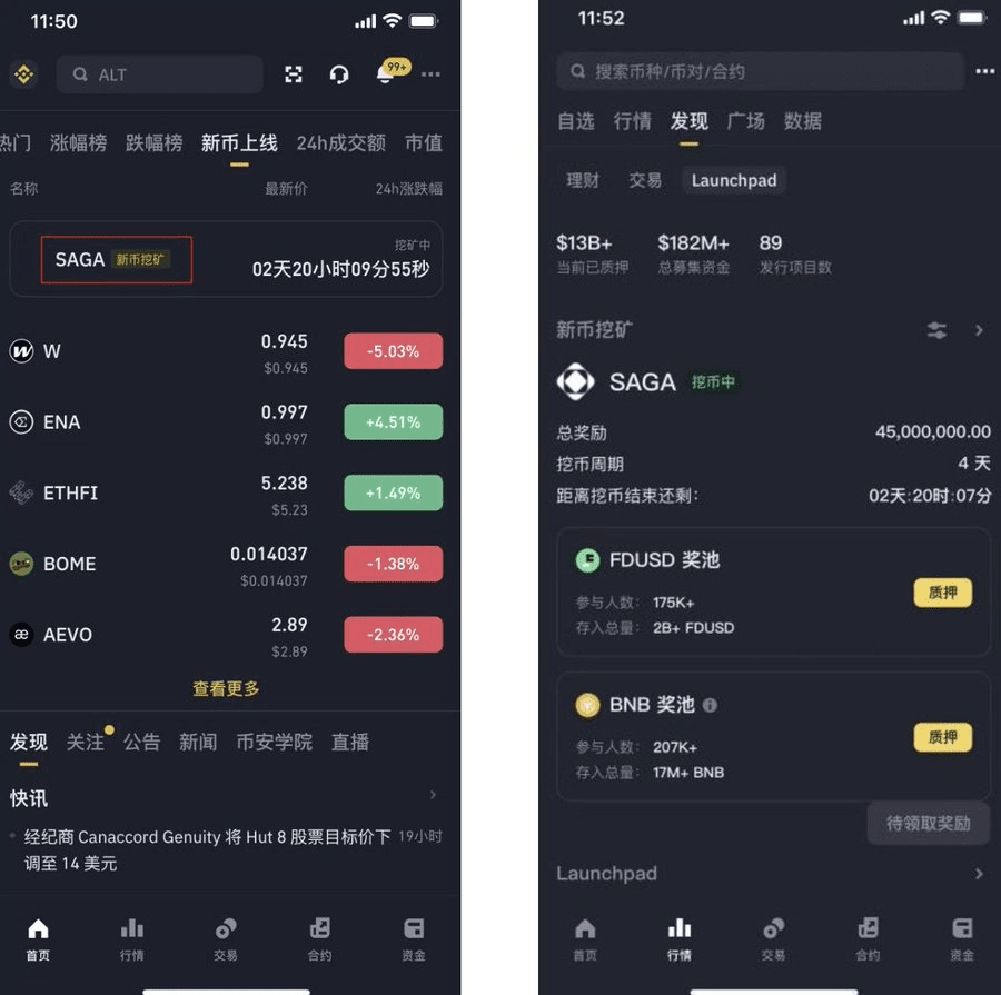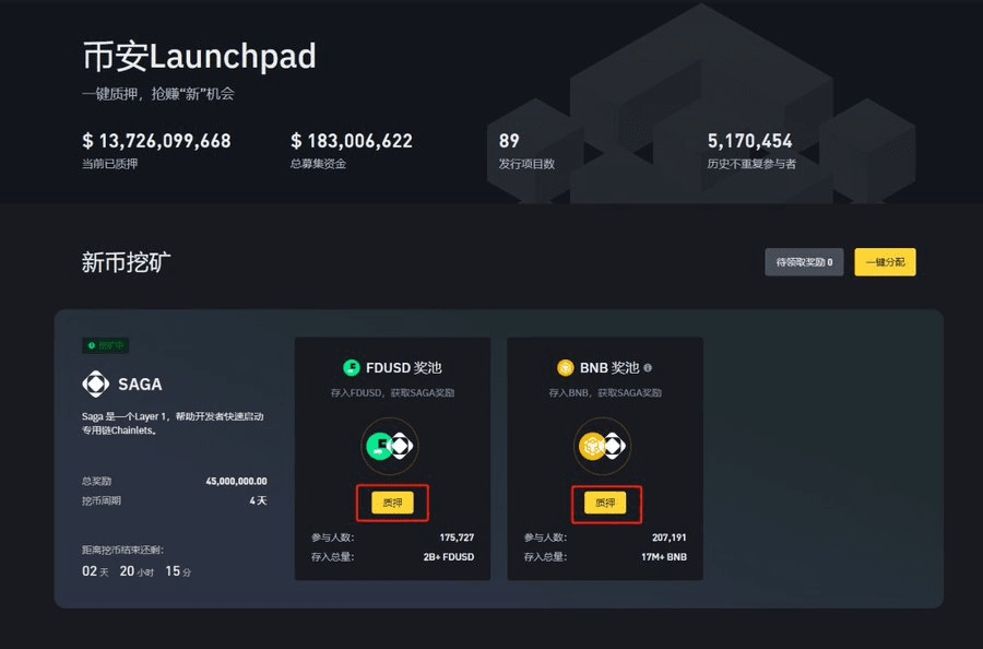 在主页中找到新币上线页面,点击SAGA(新币挖矿)进入Launchpad页面,然后选择FDUSD或者BNB再次点击质押,进入质押页面进行质押~