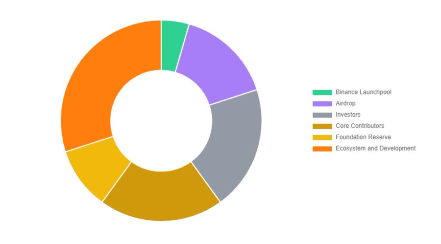 $SAGA代币是Saga协议的核心,承担多种关键功能,包括Chainlet付款、质押与奖励、治理参与等。代币总量为1,000,000,000(10亿),首次发币约为总供应量的9%,90,000,000 (9000万)个,Binance Launchpad分配总量的4.5%,即首次流通量的一半:45,000,000个(4500万)。