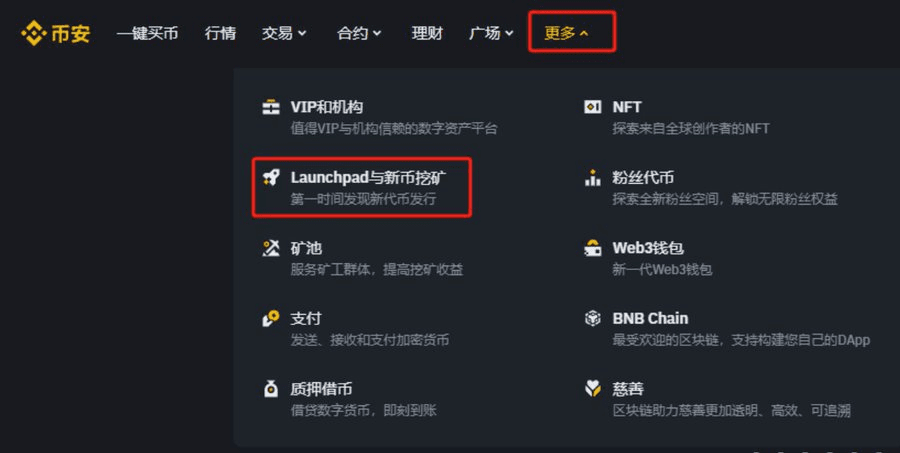 已经拥有账号的小伙伴直接点击登入即可,登入完成后,在左上角更多中,找到Launchpad与新币挖矿,点击进入