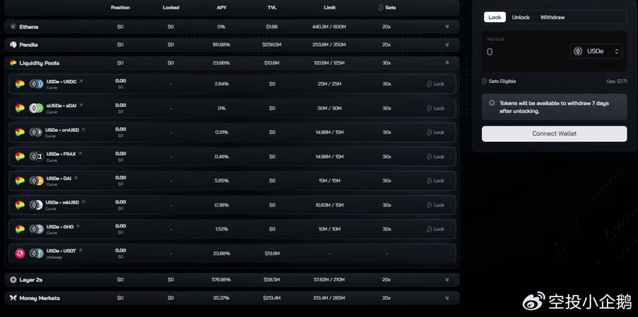 在右边Liquidity,可以质押token。但由于现在USDe池非常火爆,后续项目方应该会再次开放额度,需要看准时间抢着进去。需要注意的是,stake需要锁仓7天,组LP也需要7天锁仓。