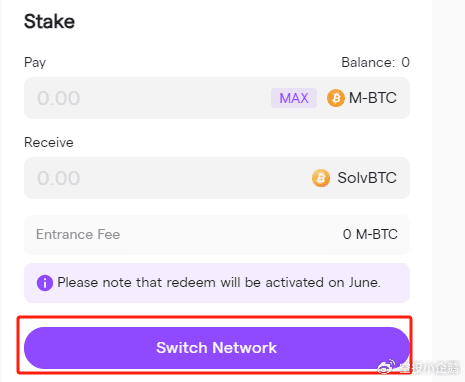 点击Merlin,进入质押页面,点击Switch Network,然后输入自己想要质押的M-BTC数量,并完成授权,点击stake,完成钱包交互后,即质押成功。