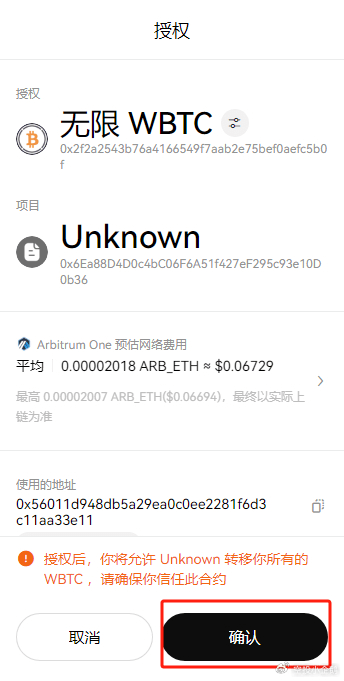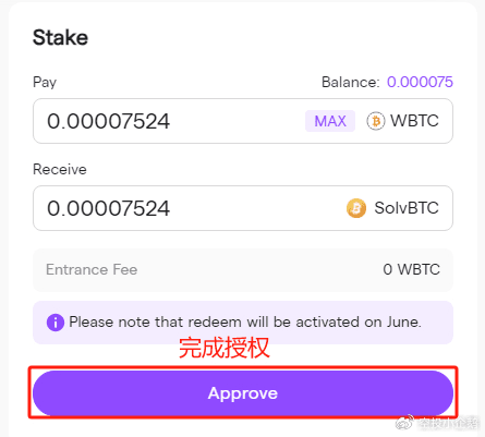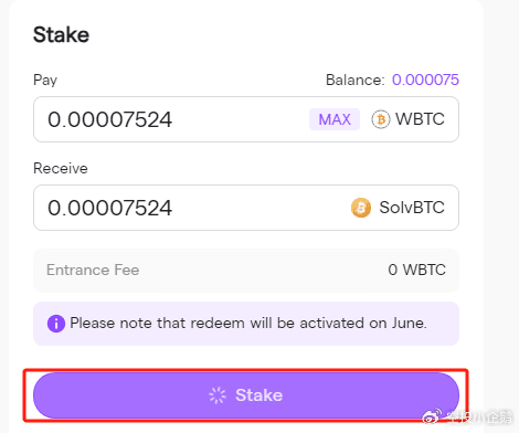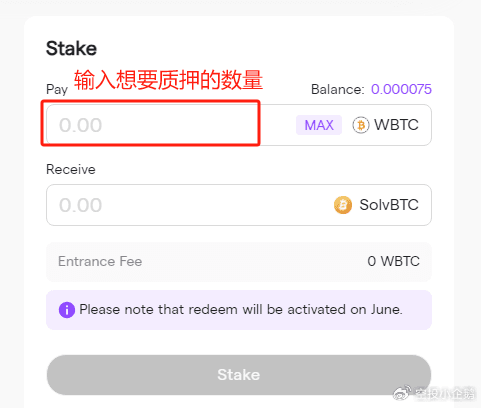 我们点击Arbitrum进入WBTC质押页面,在Stake框中输入自己想要质押的WBTC数量,并完成授权,点击stake,完成钱包交互后,即质押成功。