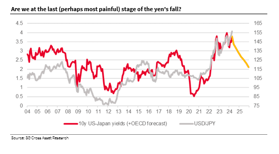 法国兴业银行外汇策略师Kit Juckes:日元的下跌已变得无序,这表明在触底前可能会出现最后的急剧下跌。目前美国收益率正在上升,而日本收益率仍然受到非常低的短期利率的支撑,这些低短期利率为做空日元交易提供了正向收益,使杠杆交易社区在过去几个月保持乐观。不过未来几个季度美元/日元的收益差距将大幅缩小。如果美元/日元的购买力平价现在在90中期水平,即使经过美国的例外论和日本化调整后公允价值仍然约为110。