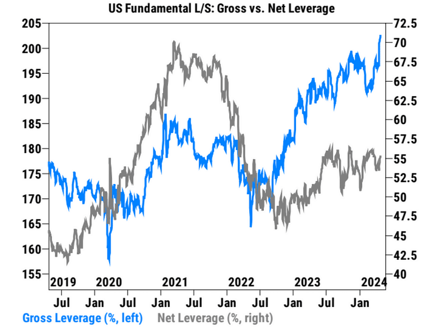 高盛基本面多空策略基金的净敞口升至55%,处于1年来的97分位,总杠杆率创5年新高。