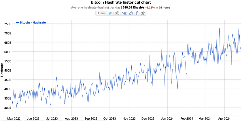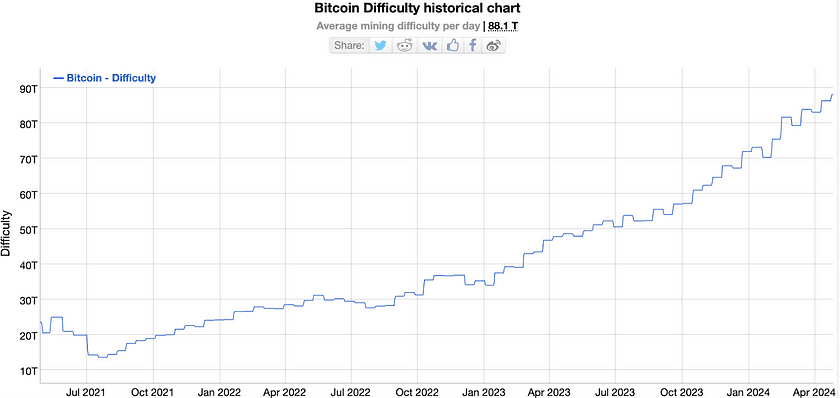 减版后BTC网络算力维持高位没有明显下降,反而挖矿难度上升:
