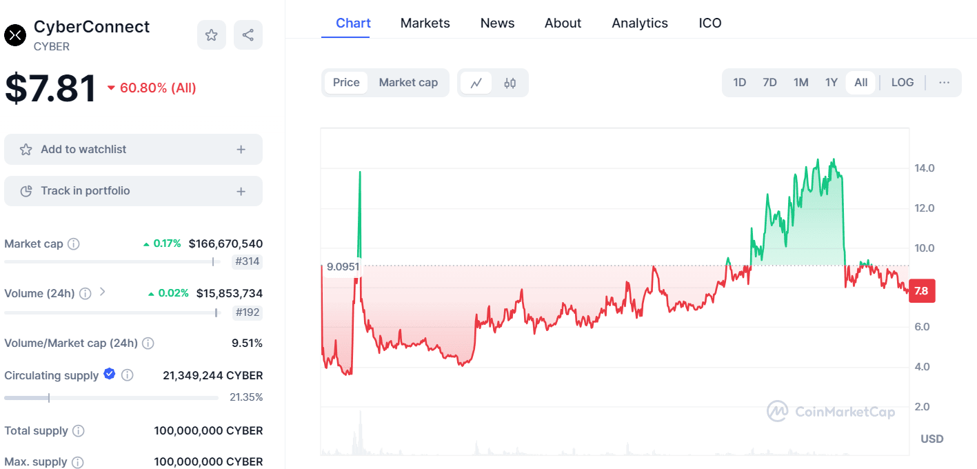 Cyberconnect代币发行时间超过两年,在上半年随着赛道炒作而价格增长,后面又跌回低点。