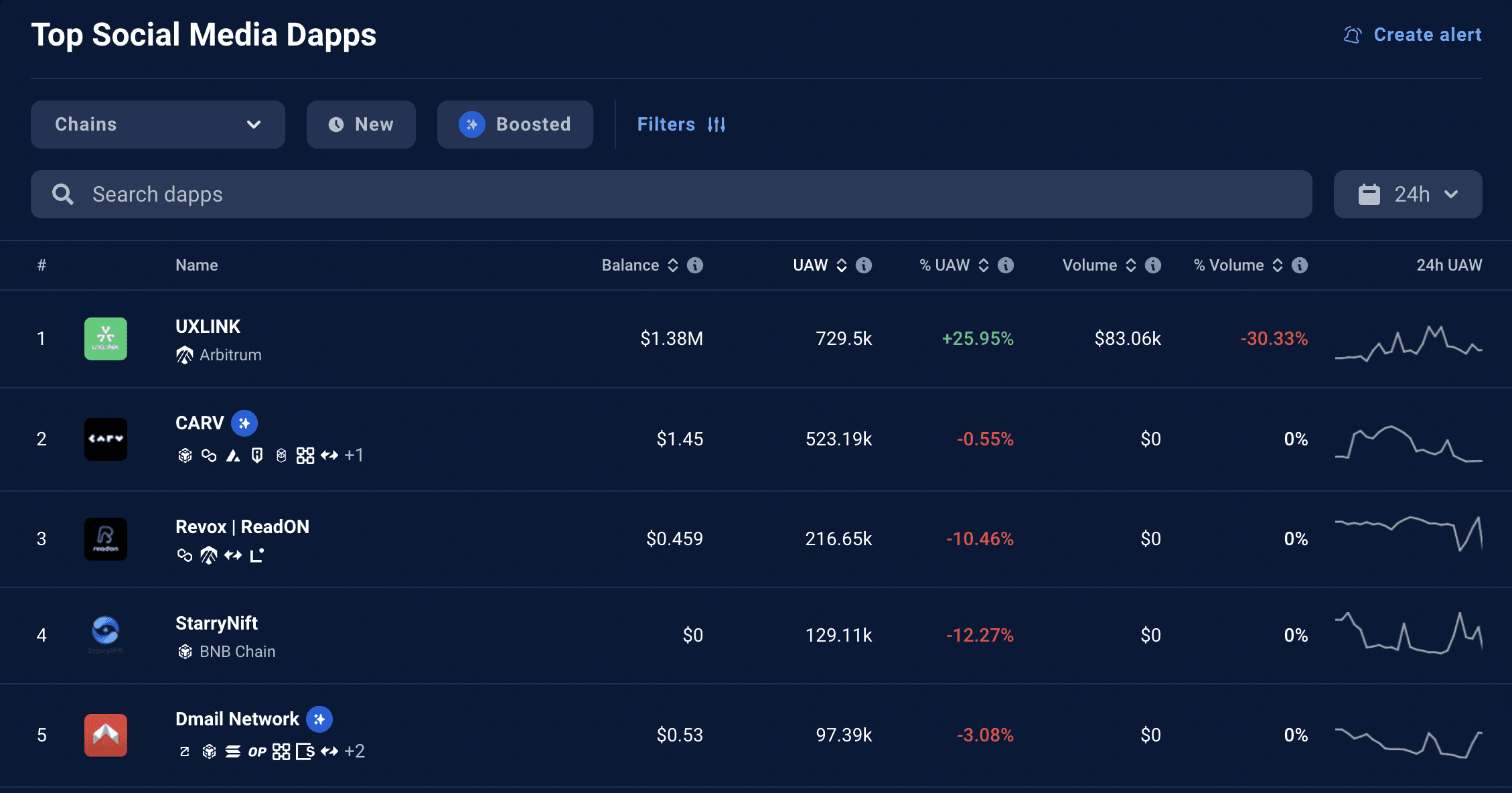 相比之下,另外三家主流的SocialFi产品的同期UAW远低于UXLINK,虽然该指标主要体现短期内各产品的链上活跃度,但也证明了当前Web3社交玩家的注意力都被极大程度上吸引到了UXLINK。