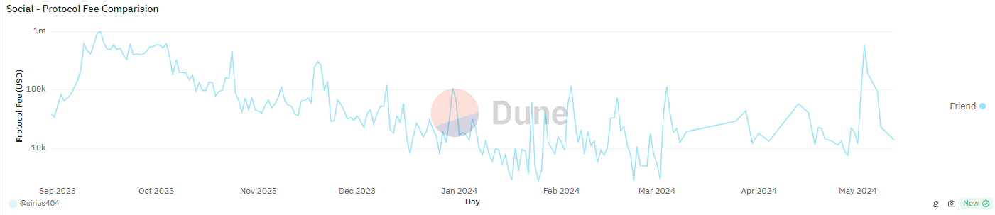 FriendTech在发布时由于创新的资产发行机制带来了高峰,后续随着热度的下滑经济体内活跃度持续下降,但在v2发行后代币空投以及创新的club设计将热度重新拔高。