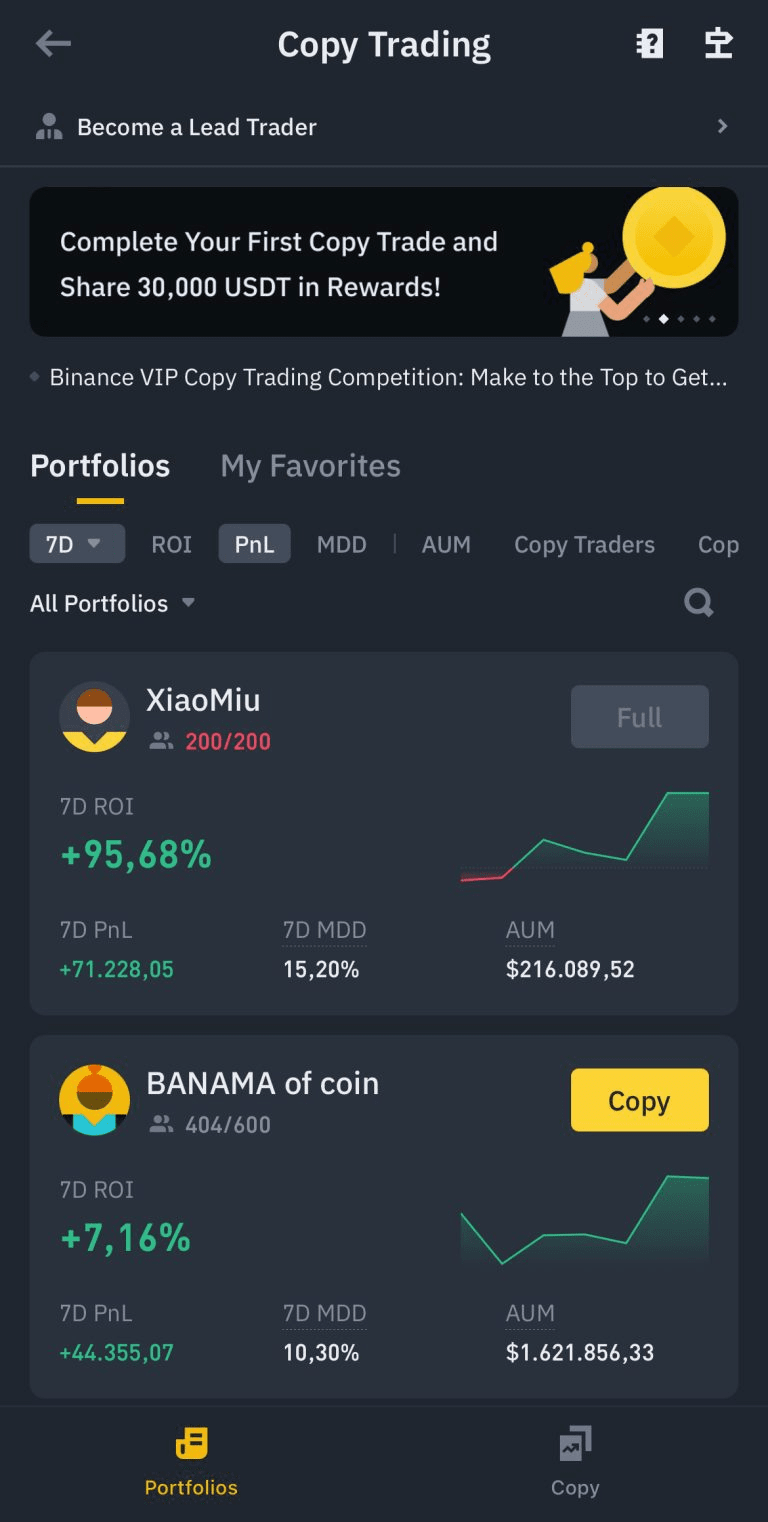 Copy Trading là tính năng cho phép người dùng sao chép chiến lược giao dịch hợp đồng tương lai theo thời gian thực của các nhà giao dịch có kinh nghiệm và những người này được gọi là Nhà giao dịch chính. Nhà giao dịch sao chép có thể hưởng lợi từ kiến thức chuyên môn giao dịch của Nhà giao dịch dẫn đầu, trong khi Nhà giao dịch dẫn đầu có thể kiếm được 10% chia sẻ lợi nhuận, 10% hoa hồng và các lợi ích độc quyền khác từ Nhà giao dịch sao chép của họ. Sao chép giao dịch có sẵn trên cả trang web Binance và Ứng dụng Binance cho người dùng ở các khu vực đủ điều kiện.
