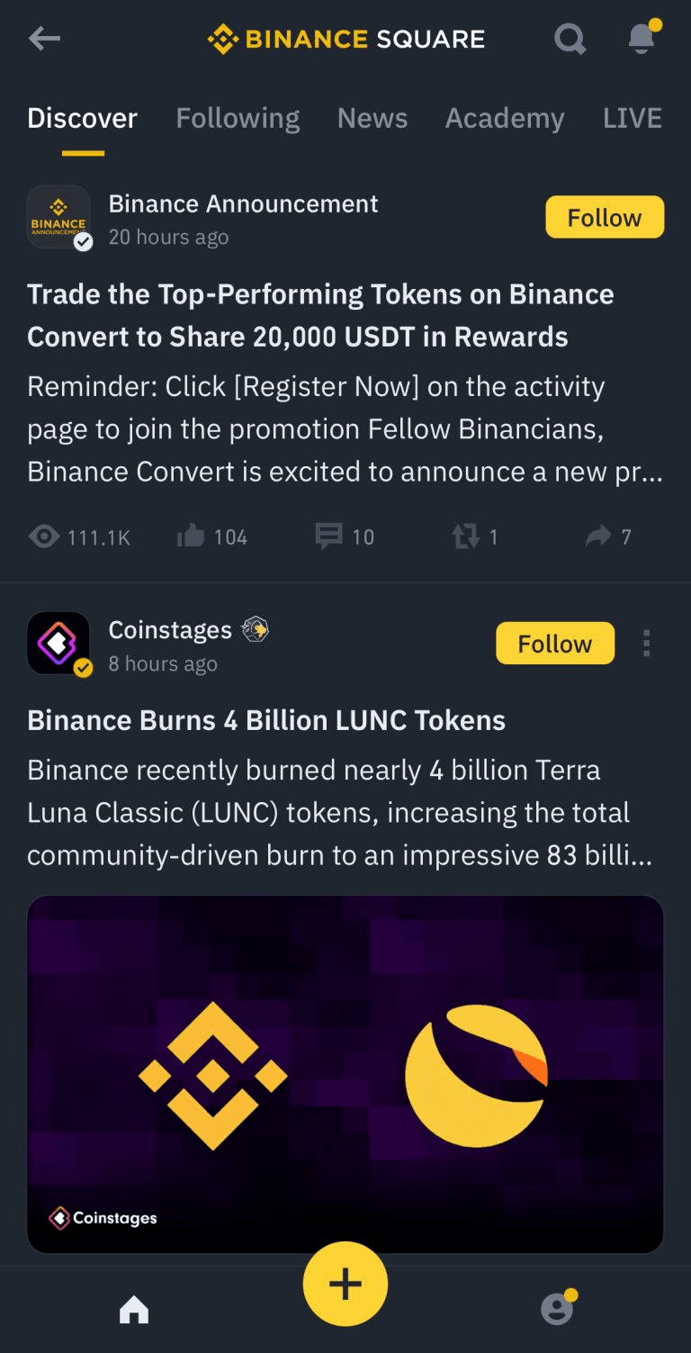 Binance Square là tính năng mới lấy người dùng làm trung tâm vì nó cung cấp cho người dùng nguồn thông tin và giải trí phong phú và đa dạng trong hệ sinh thái tiền điện tử và Web3. Người dùng có thể khám phá, theo dõi và tương tác với nhiều chủ đề, đối tác truyền thông, người dẫn đầu quan điểm chính và các dự án trên nền tảng, đồng thời luôn cập nhật những phát triển và cơ hội mới nhất trong ngành. Người dùng cũng có thể bày tỏ ý kiến, chia sẻ kinh nghiệm và thể hiện tài năng của mình trên nền tảng, đồng thời nhận được phần thưởng và sự công nhận từ đồng nghiệp và người hâm mộ.