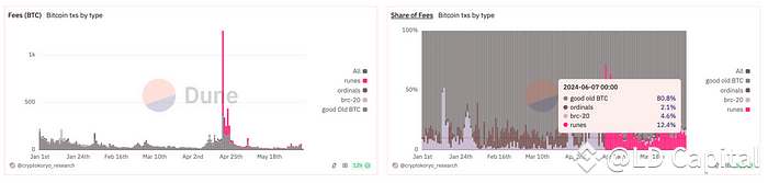 (3)该资产的火热可以进一步解决比特币的安全预算问题。符文的交易可以为网络贡献更多的交易费用,特别在减半后,矿工的出块产出减少后有了新的收入来源,对维护网络的安全性和可持续性有积极作用。