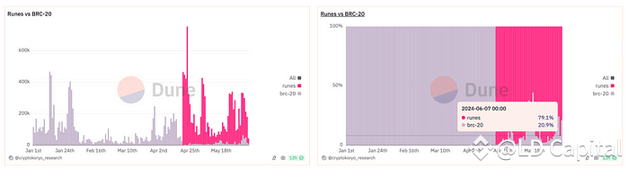 对比符文与BRC-20,当前符文已成为非BTC交易之外交易最活跃的L1资产,二者的比例在4:1左右,符文占比最高出现在减半推出时,约为99%,最低约为55%,当前符文交易热度已超越BRC-20代币。