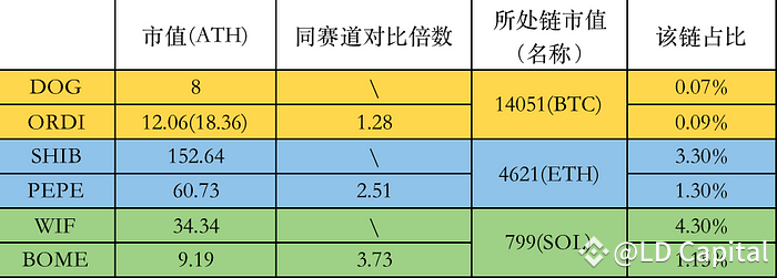 若把符文与BRC20当前均视为meme,相比于其他链meme币的市值,比特币链上的meme市值占比最低,不足该链的0.1%。横向对比,ETH与SOL链的meme龙头占比均为该链市值的3%以上,BTC作为共识,市值,和主流资金关注最高的链,meme币的市值占比有进一步扩大的动力。纵向对比,在当前符文整体在交易量,贡献费用方面已超过BRC-20,但符文的龙一相较于BRC-20的龙一亦有差距,若能登陆一线CEX,则具有超越ORDI的潜力。
