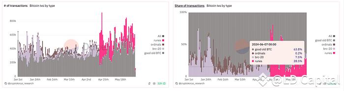 1、符文是专门为可替代代币设计的协议,技术上相比BRC-20具有更简单,更高效,更兼容的特点,在交易份额占比,交易费用贡献方面已超越BRC-20代币,成为必须重视的新资产形式。