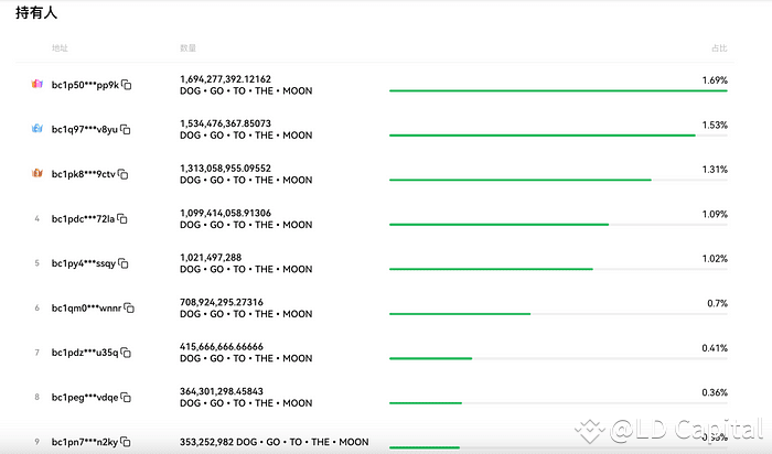 DOG的链上持有人稳定保持在7w+,排名符文第三,因主要的流动性在CEX上,实际的持有人应该依然为第一,持有人数庞大,共识强烈。但链上地址最大的持币比例为1.69%左右,,且近日在不断减持,超过1%的仅有5个地址,排名第五的地址在快速增持,但整体筹码程度的不够集中,可能造成了虽然当前龙一地位明确但无法上一线CEX的原因。