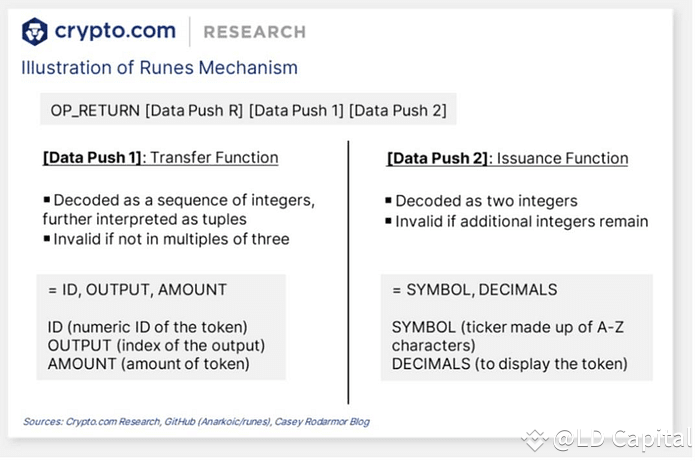 具体来说, Runes 的数据存储在 OP_RETURN 字段中,这是来自比特币交易的操作代码,(“opcode”)并允许在交易输出中存储 80 字节数据。交易在协议消息中使用 OP_RETURN 标记,后跟大写字母 R 的数据推送。发行或转移交易在后续的数据推送中指定并分配给UTXO。无效的协议消息将导致符文被烧毁。