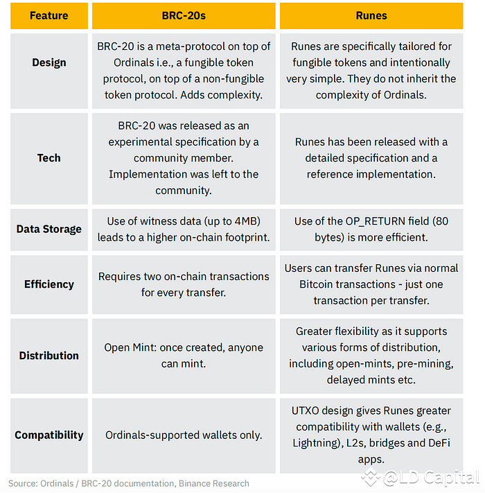 (1)Runes是专门设计为可替换代币,基于BTC原生的架构即可,不依赖链下数据且只需要一次铸造,更为简单高效。而BRC-20是以更适合构建非同质化代币的Ordinals协议为基础的,依赖链下索引,且需要铸造两次,整体更为复杂。