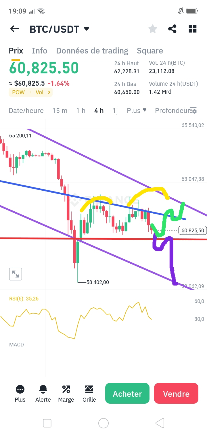 ..//Nous attendons donc ce que les choses vont donner. Bien sûr, il y a une possibilité de rebond au niveau de la ligne rouge et de retour au sommet du canal parallèle, ainsi que la hausse maximale qui peut être à l'intérieur du canal croisé. en cas de rebond, ce sera le niveau de 62 700$, et si nous le cassons, nous serons au rendez-vous avec les niveaux de 64 000$...