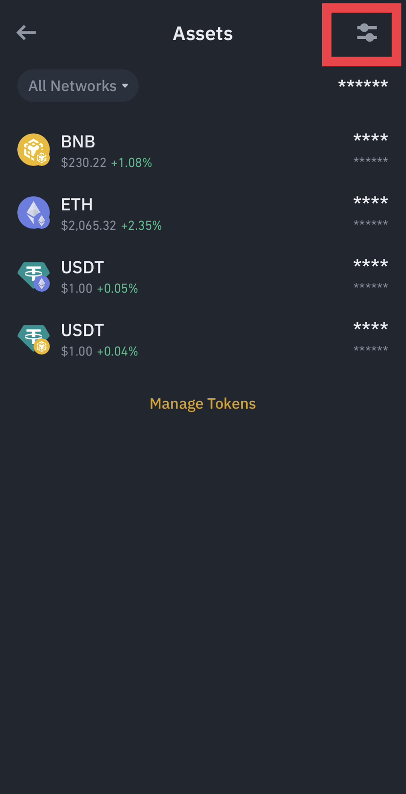 7. Procédez à l'ajout d'un jeton Bep20 à partir d'ici lorsque vous cliquez également sur cette icône, vous pouvez gérer votre liste et votre sélection de jetons.