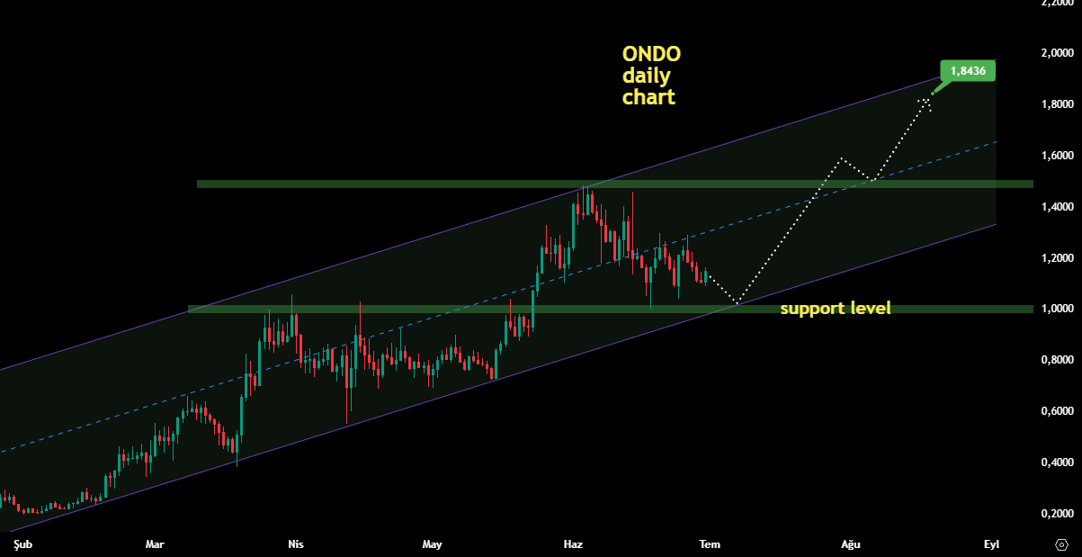 L'analyse graphique actuelle d'ONDO Token pointe vers une tendance haussière potentielle. Les traders et les investisseurs devraient surveiller de près le niveau de support autour de 1,00 $. Un rebond réussi à partir de ce niveau pourrait ouvrir la voie à une hausse significative vers 1,8436 $.