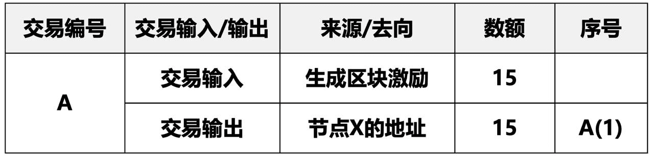 Transaction A : Supposons qu'un nœud mineur X reçoive une récompense de 15 bitcoins grâce au minage. Ces 15 bitcoins constituent initialement une sortie de transaction non dépensée (UTXO).